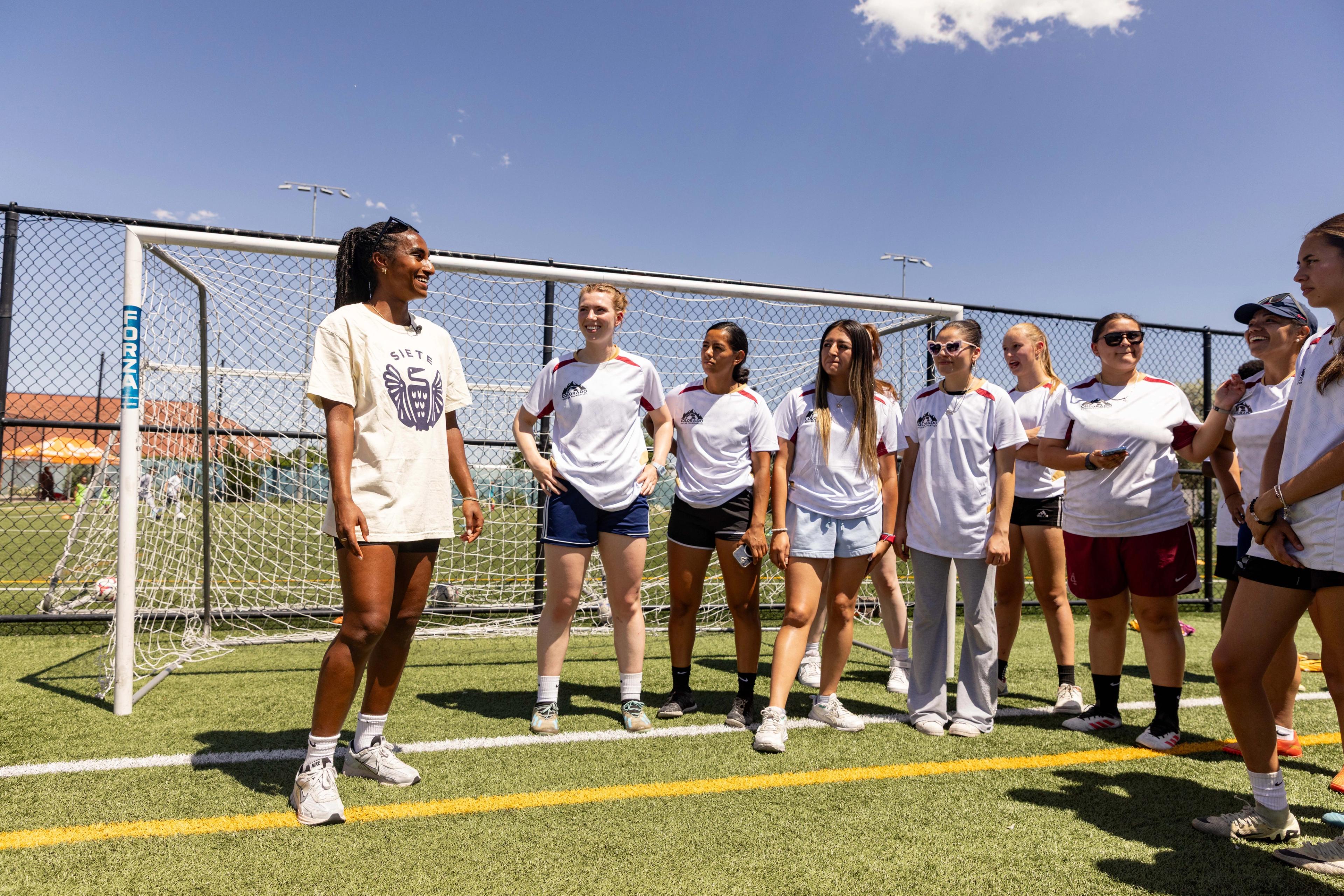The first clinic took place at Soccer City Aurora in Denver and was led by USWNT and Chelsea defender Naomi Girma. The second was held at Fort Worth Youth Soccer Association in the Dallas area, led by professional soccer player and Dallas native Diana Ordoñez. Each clinic brought together 100 to 150 youth players for two hours of soccer skill stations, a Q&A with the featured athlete, autographs, a meet-and-greet, and Siete product giveaways.